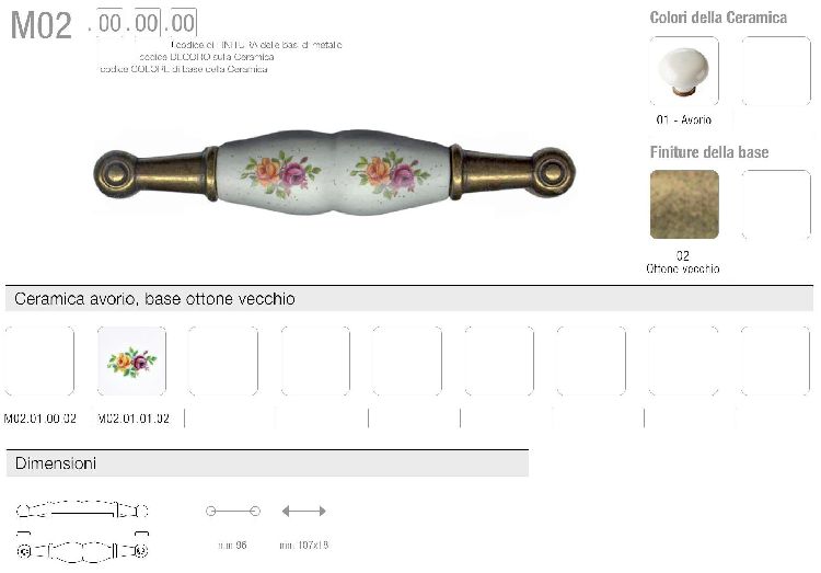Maniglietta METALSTYLE modello M02 interasse 96 per mobile in ferro ottone vecchio e porcellana avorio