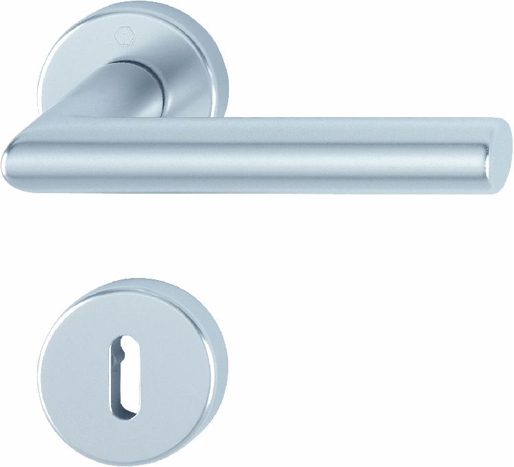 Maniglia HOPPE modello AMSTERDAM per porta interna su rosetta e bocchetta con foro normale in alluminio argento