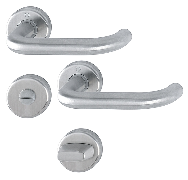 Maniglia HOPPE modello BADEN per porta interna su rosetta e bocchetta con nottolino wc in acciaio inox satinato